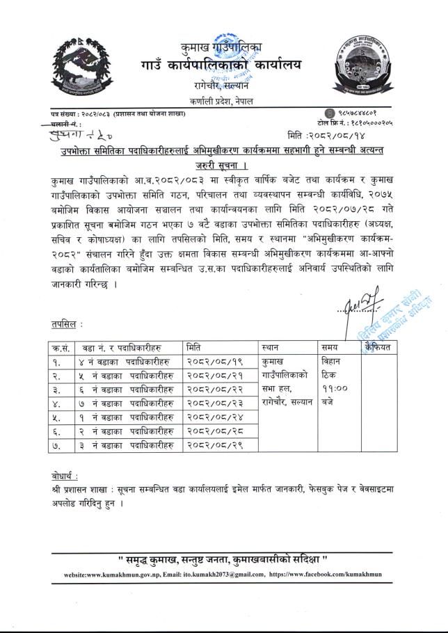 उपभोक्ता समितिका पदाधिकारीहरुलाई अभिमुखिकरण कार्यक्रममा सहभागि हुने सम्बन्धी अत्यन्त जरुरी सूचना ।