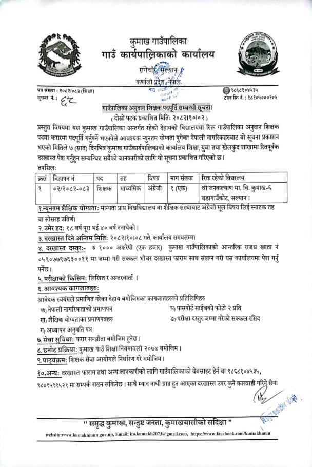 गाउपालिका अनुदान सिक्षक् पदपूर्ति सम्बन्धि सुचना