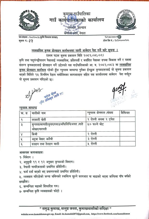 » व्यावसायिक कृषक प्रोत्साहन कार्यक्रमका लागि आवेदन पेश गर्ने बारे सूचना ।