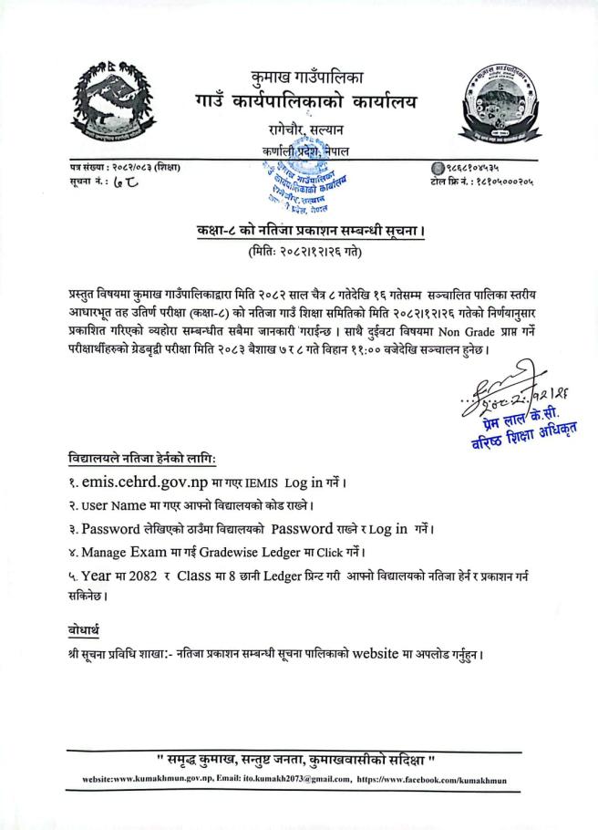 कक्षा-८ को नतिजा प्रकाशन सम्बन्धि सुचना ।