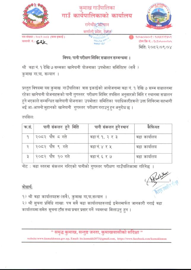 पानी परीक्षण शिविर सञ्चालन सम्बन्धमा ।