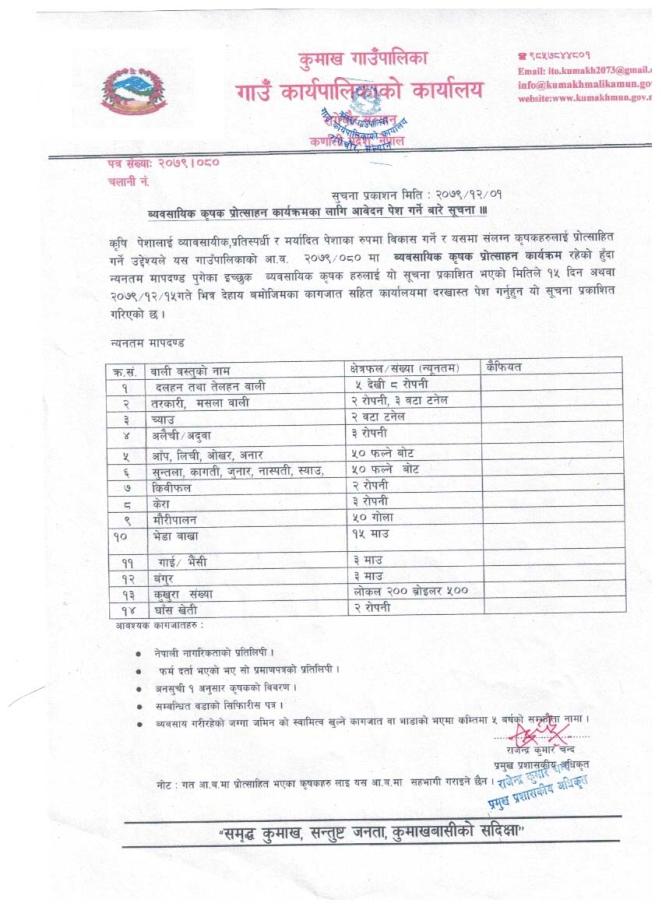 » व्यवसायिक कृषक प्रोत्साहन कार्यक्रमका लागि आवेदन पेश गर्ने बारे सूचना ।